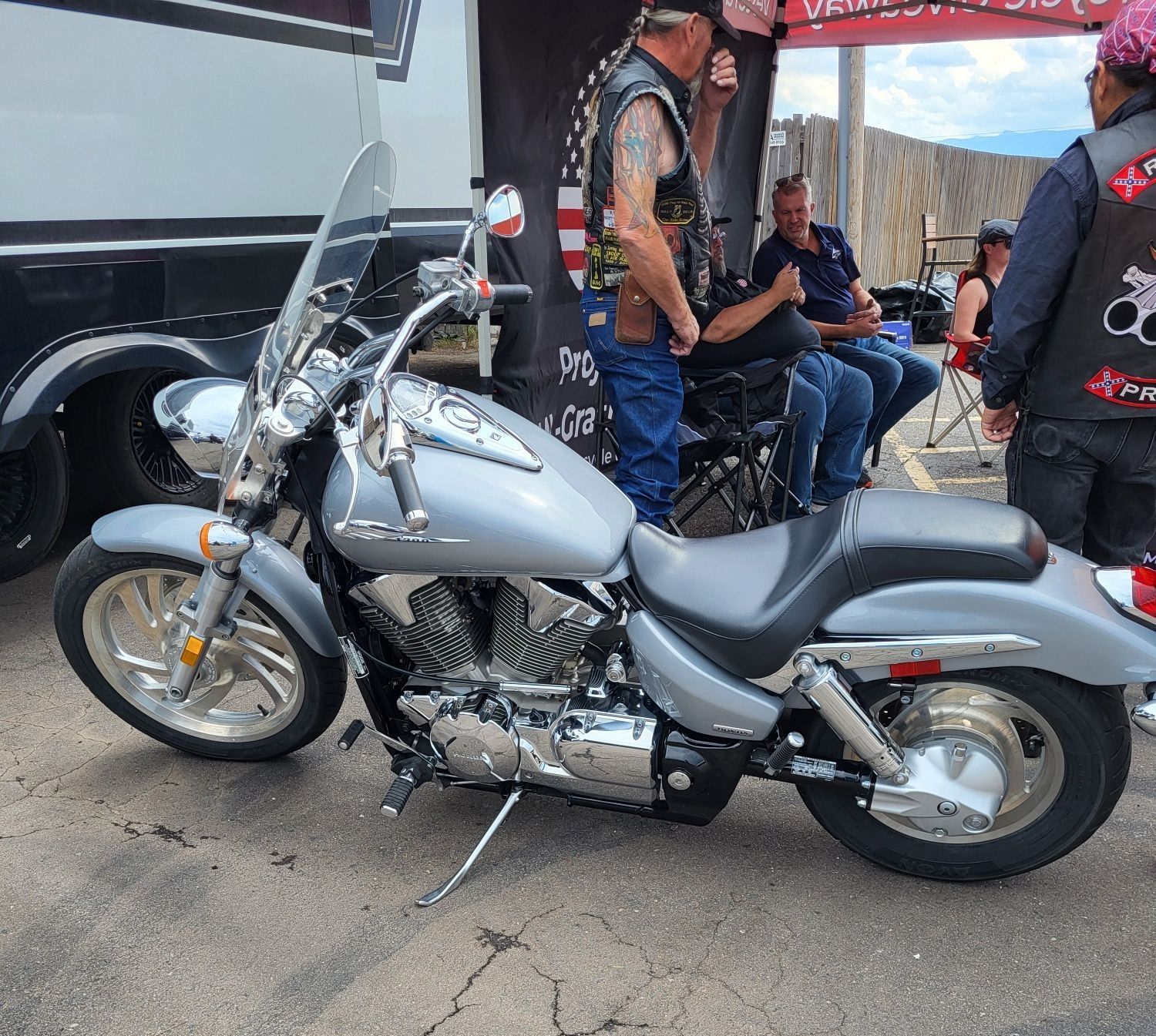 Kim met Neil McCabe a few years back though her pool league. Over that time Kim got to know Neil and learned that he is an Army veteran that served as a Squad Automatic Gunner with the 25th Infantry Division. Neil faced the darkness in his service and on most days he is reminded of it. On Memorial Day, Neil holds his own ceremony at Fort Logan National Cemetery to honor those that fell beside him. Neil is a man of honor and although he's now a veteran, he still carries his team these many years later. It is for these qualities that he was nominated to receive a motorcycle. But, the motorcycle he will receive is no ordinary bike. It may look like any other 2002 Honda VTX 1800 R, but this one is special. This bike is the bike. It's the one that started our nonprofit. After Kim's original bike was stolen, Mark Lockman stepped up and donated this bike to Kim. At the same time, her stolen bike was recovered, but badly chopped. Kim was so moved by Mark's gesture, that she and Mark Jester and several others worked together to restore her original bike so it could be given to another veteran in need. That was A. J. Naylor. Let's watch the giveaways.